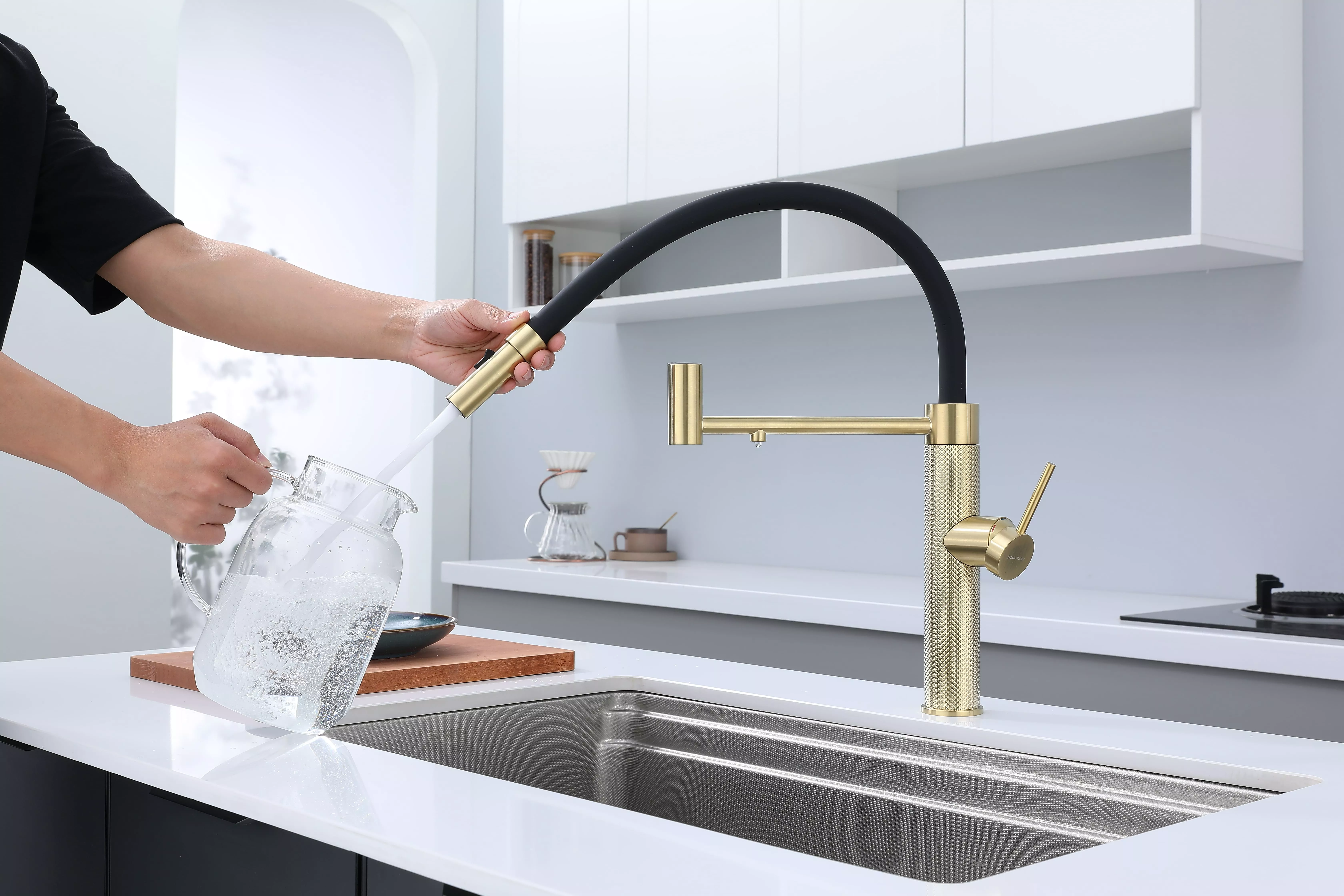 Смеситель для кухни GANYMEDE DIAMOND сочетает в себе стильный дизайн и передовые технологии. Благодаря функции подключения фильтра питьевой воды и специальной технологии Trinkwasser® водопроводная и очищенная вода никогда не смешиваются, а управление ими осуществляется единым удобным рычагом 2в1. Гибкий силиконовый излив обеспечивает широкий диапазон движений и надежно фиксируется элементом корпуса в форме кольца. На конце излива расположена кнопка для переключения между режимами струи и душа, что идеально подходит для мытья посуды и продуктов. Декоративные насечки на корпусе создают игру света и делают модель эксклюзивной. Излив поворачивается на 360°, а расширенная гарантия производителя составляет 8 лет.