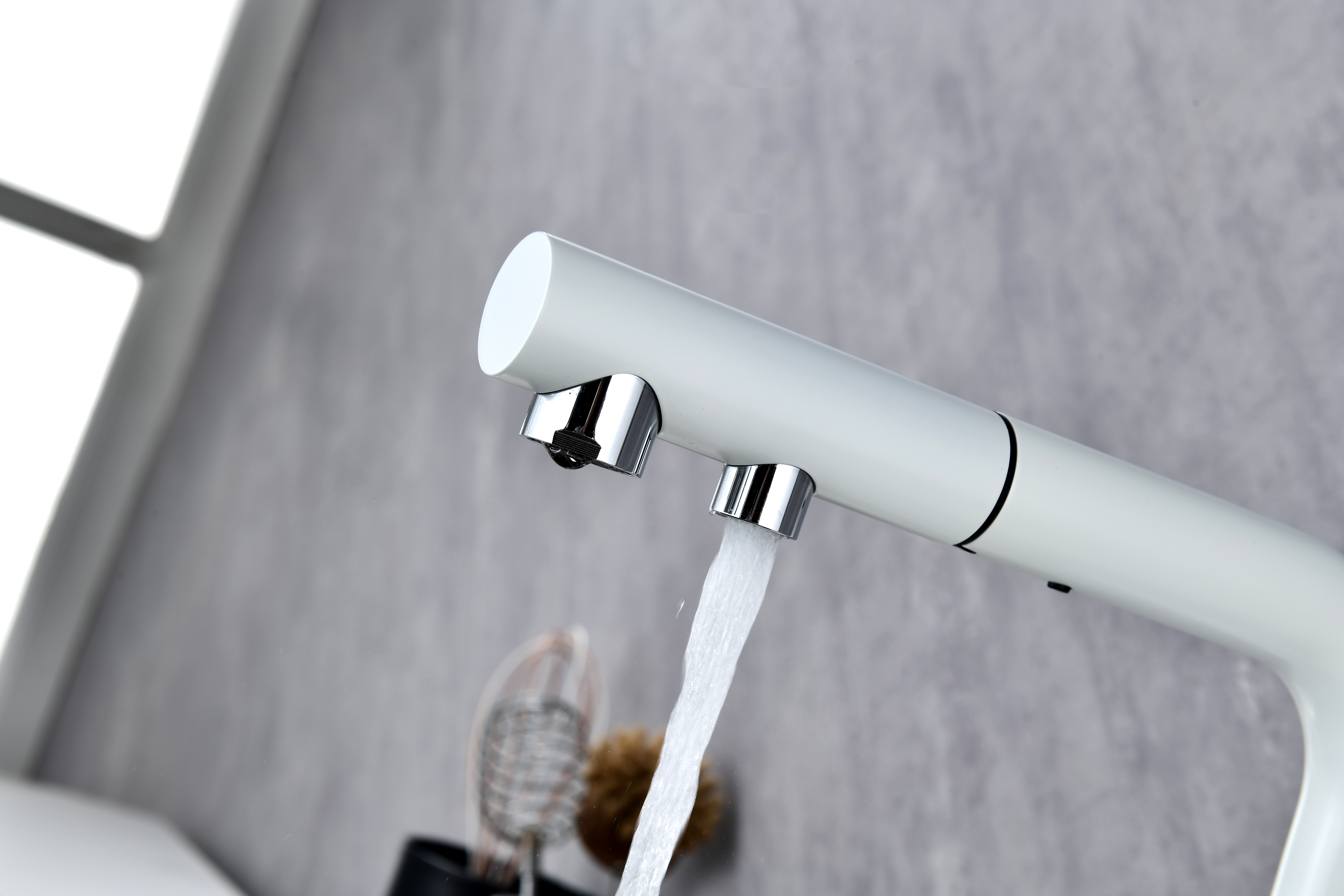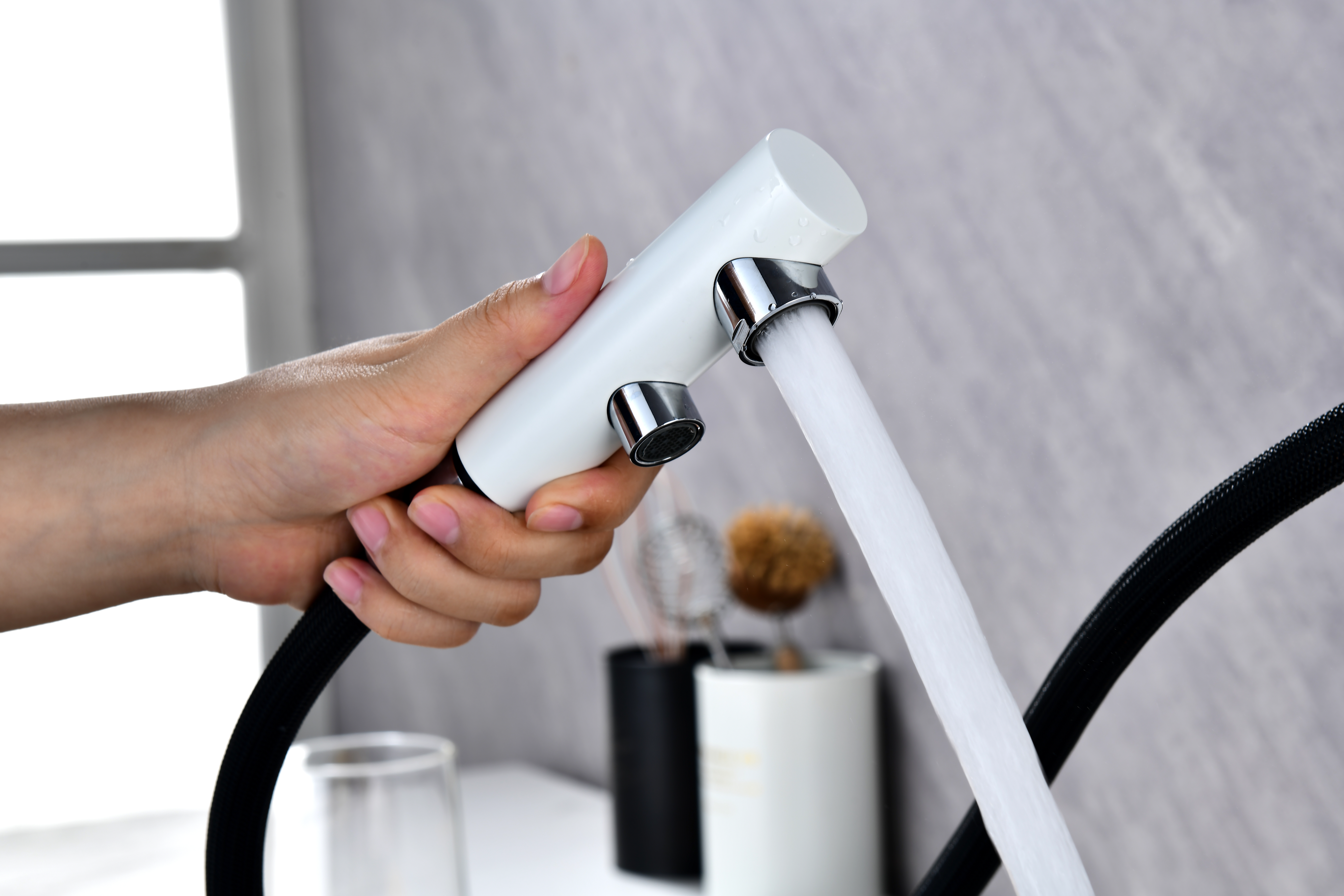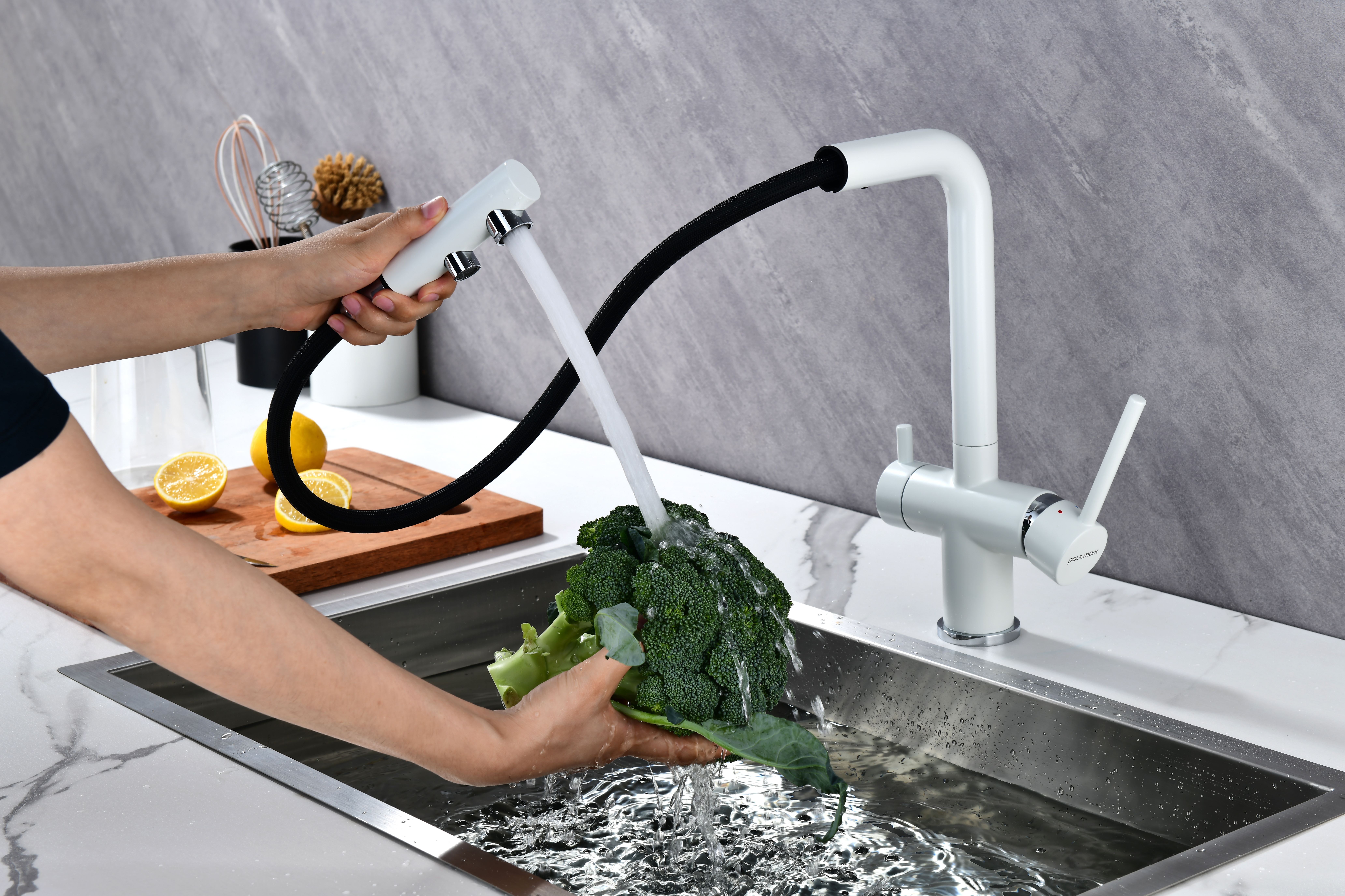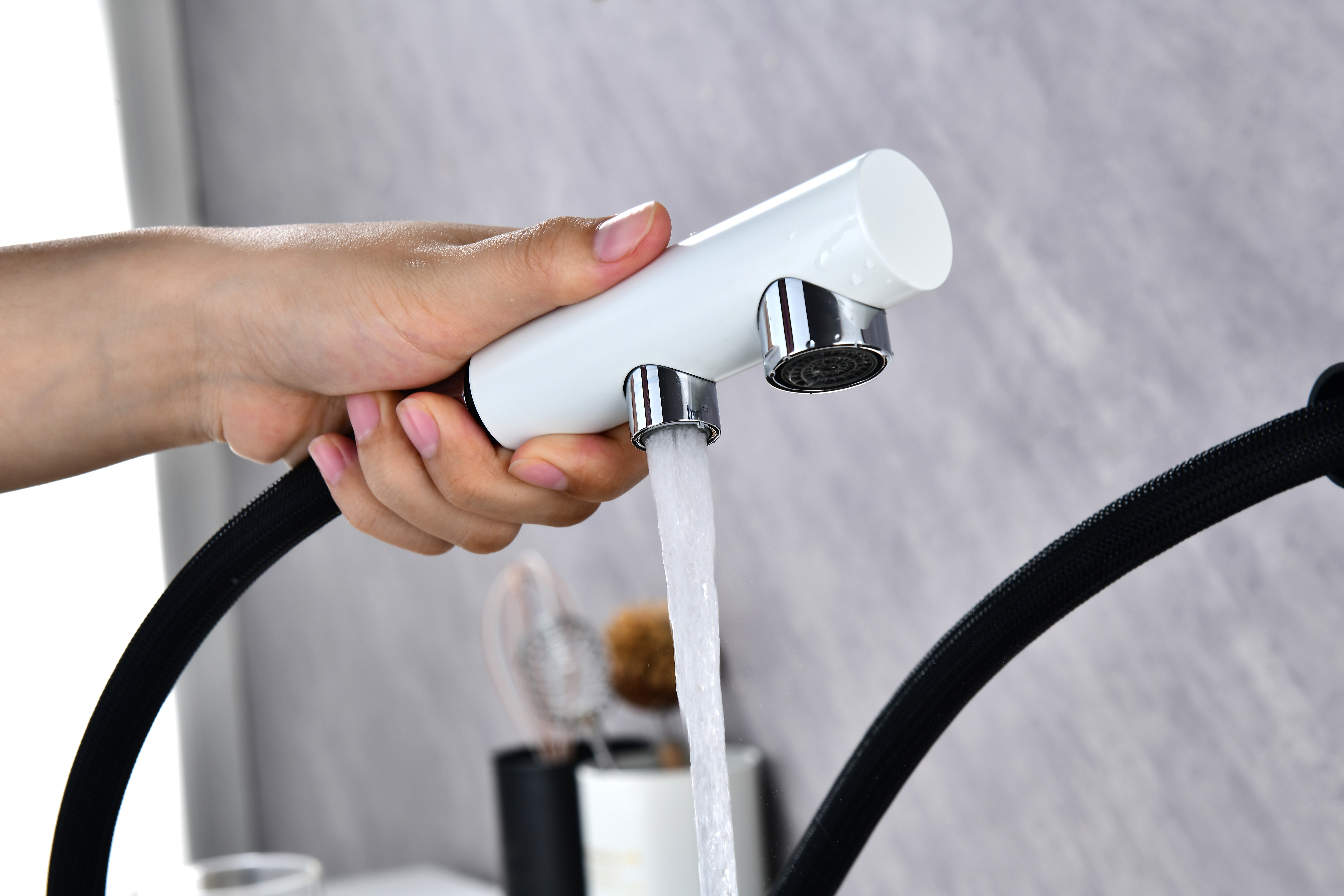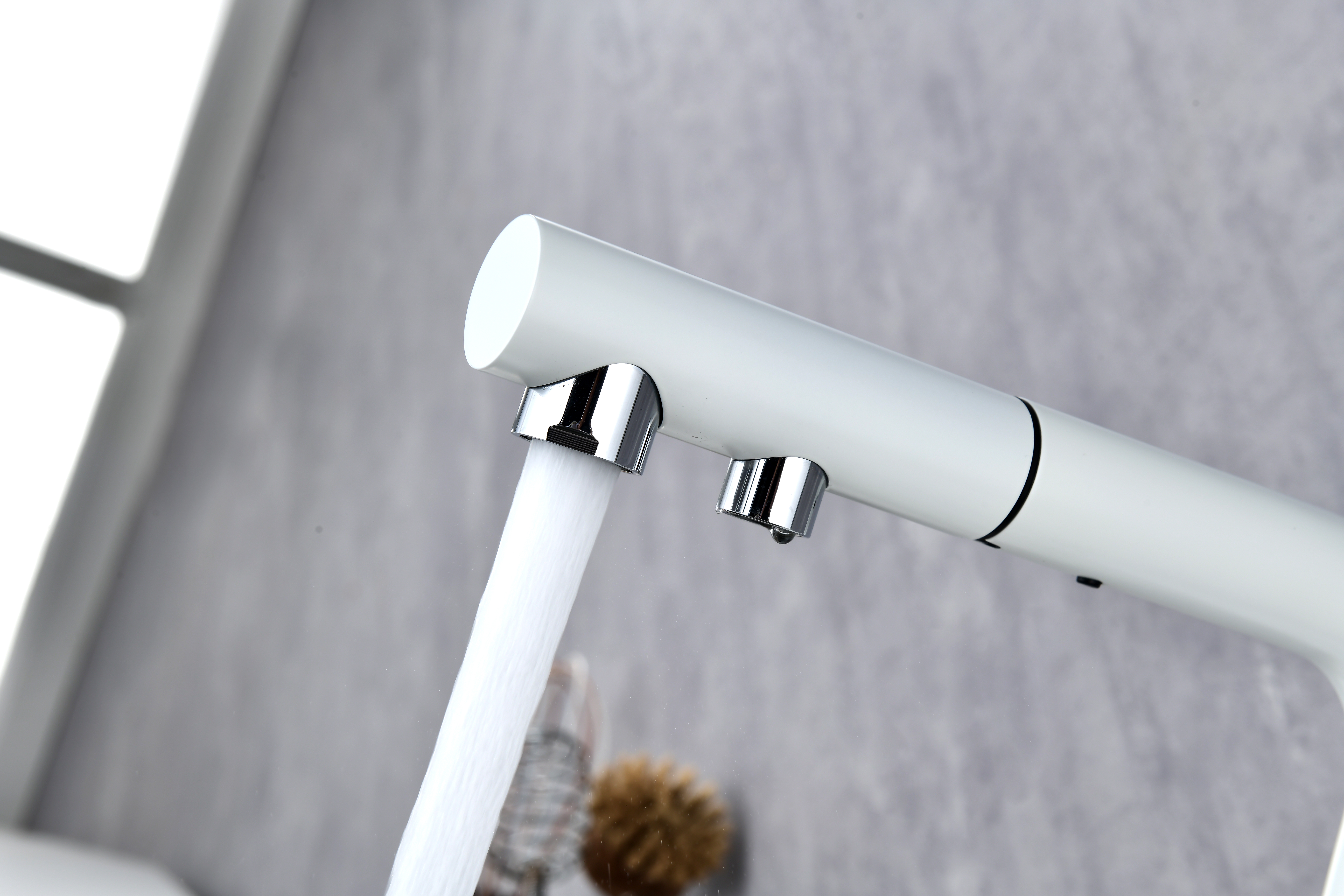 Смеситель оснащен гибким выдвижным изливом из нейлоновой оплетки, которая обладает отличной устойчивостью к истиранию и разрушению. Данная техническая особенность расширяет рабочую зону смесителя, позволяя пользоваться им с удобством в больших мойках, мойках с двумя чашами, или наполнять водой ёмкость на столе рядом с мойкой, в том числе питьевой водой.