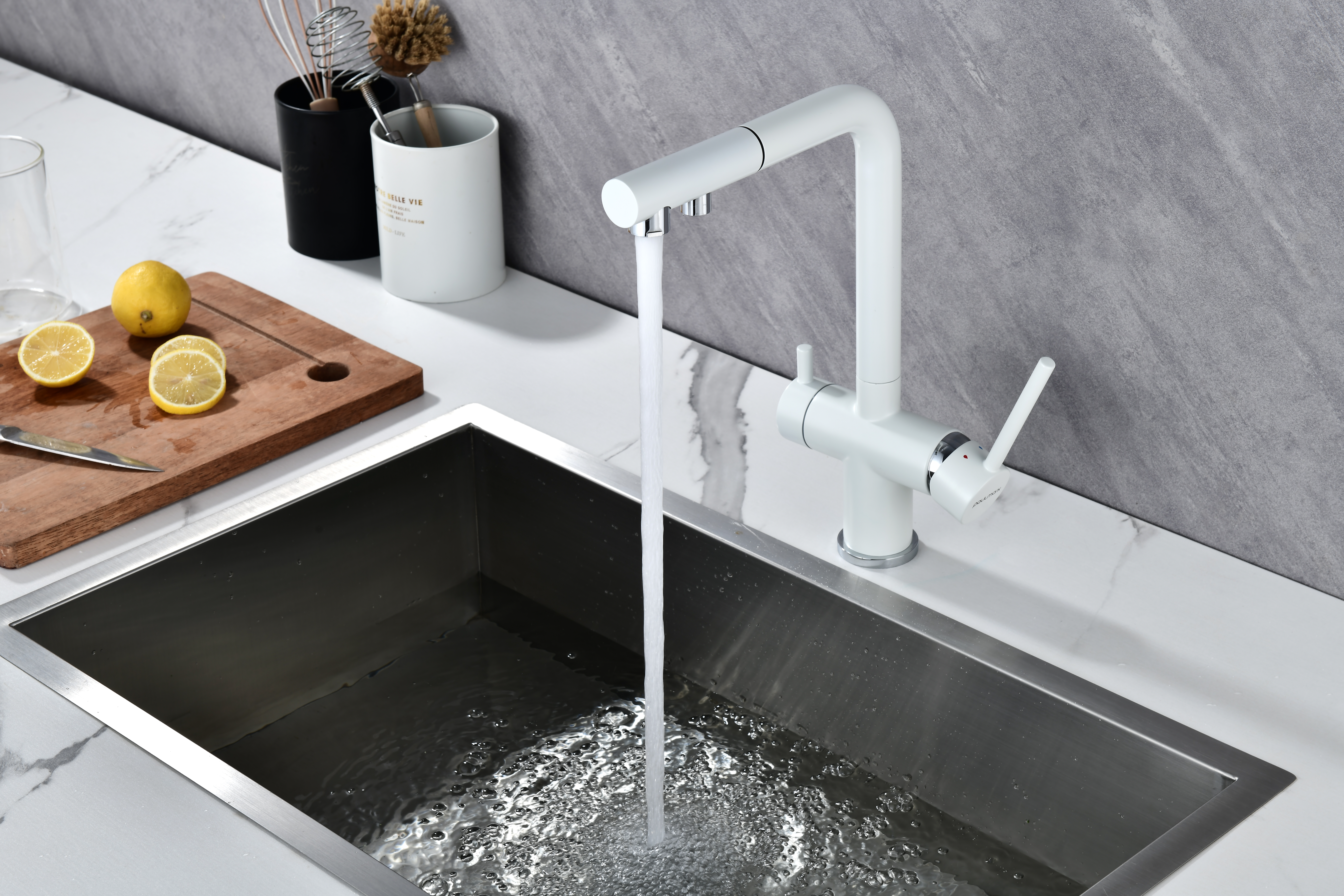SERPENTINE оснащён функцией TRINKWASSER - излив смесителя имеет встроенный независимый канал для питьевой воды из фильтра, таким образом питьевая и водопроводная вода не смешиваются. Управление питьевой водой осуществляется отдельным рычагом, расположенным слева. Для пуска водопроводной воды используется большой рычаг справа.