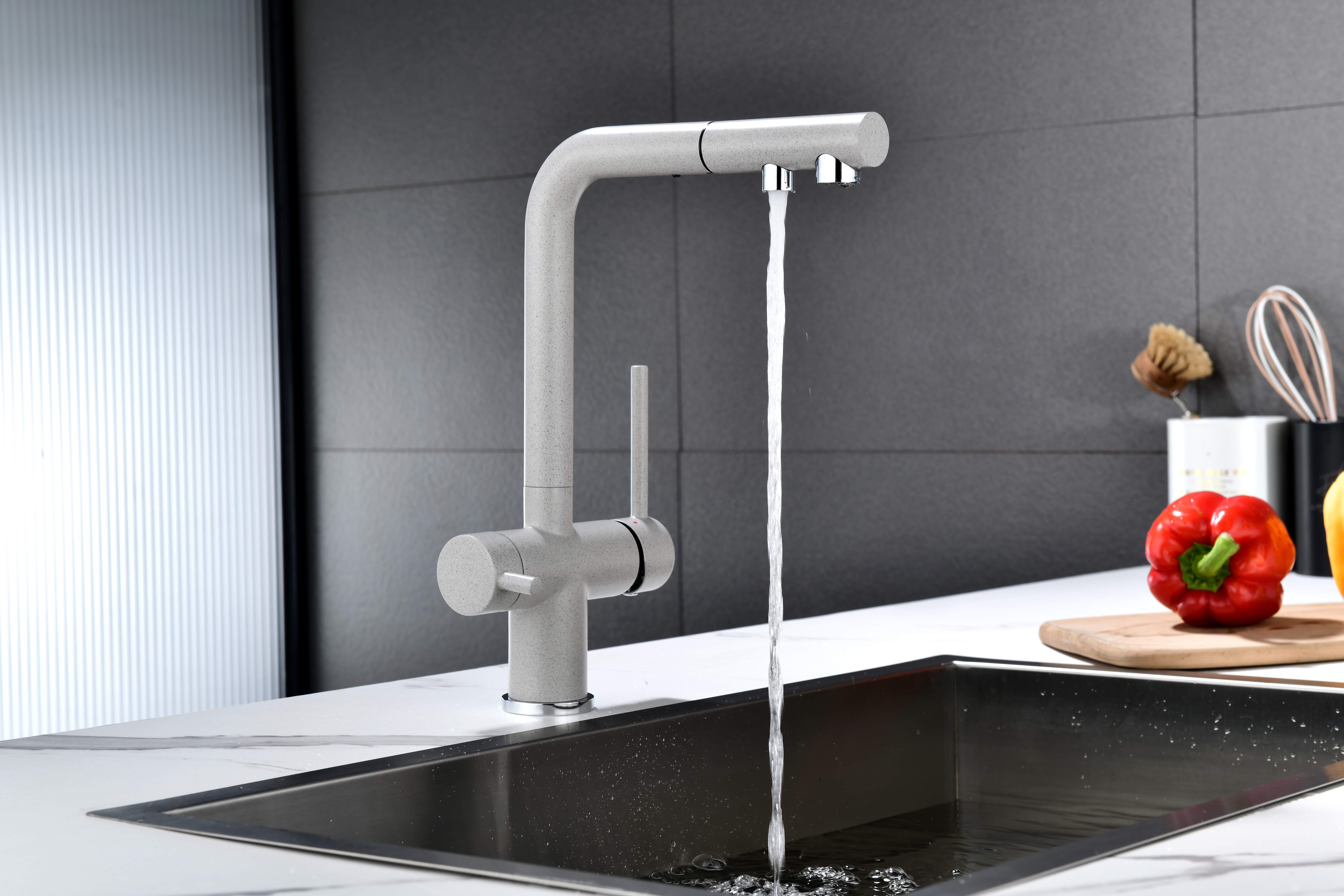 SERPENTINE оснащён функцией TRINKWASSER - излив смесителя имеет встроенный независимый канал для питьевой воды из фильтра, таким образом питьевая и водопроводная вода не смешиваются. Управление питьевой водой осуществляется отдельным рычагом, расположенным слева. Для пуска водопроводной воды используется большой рычаг справа.