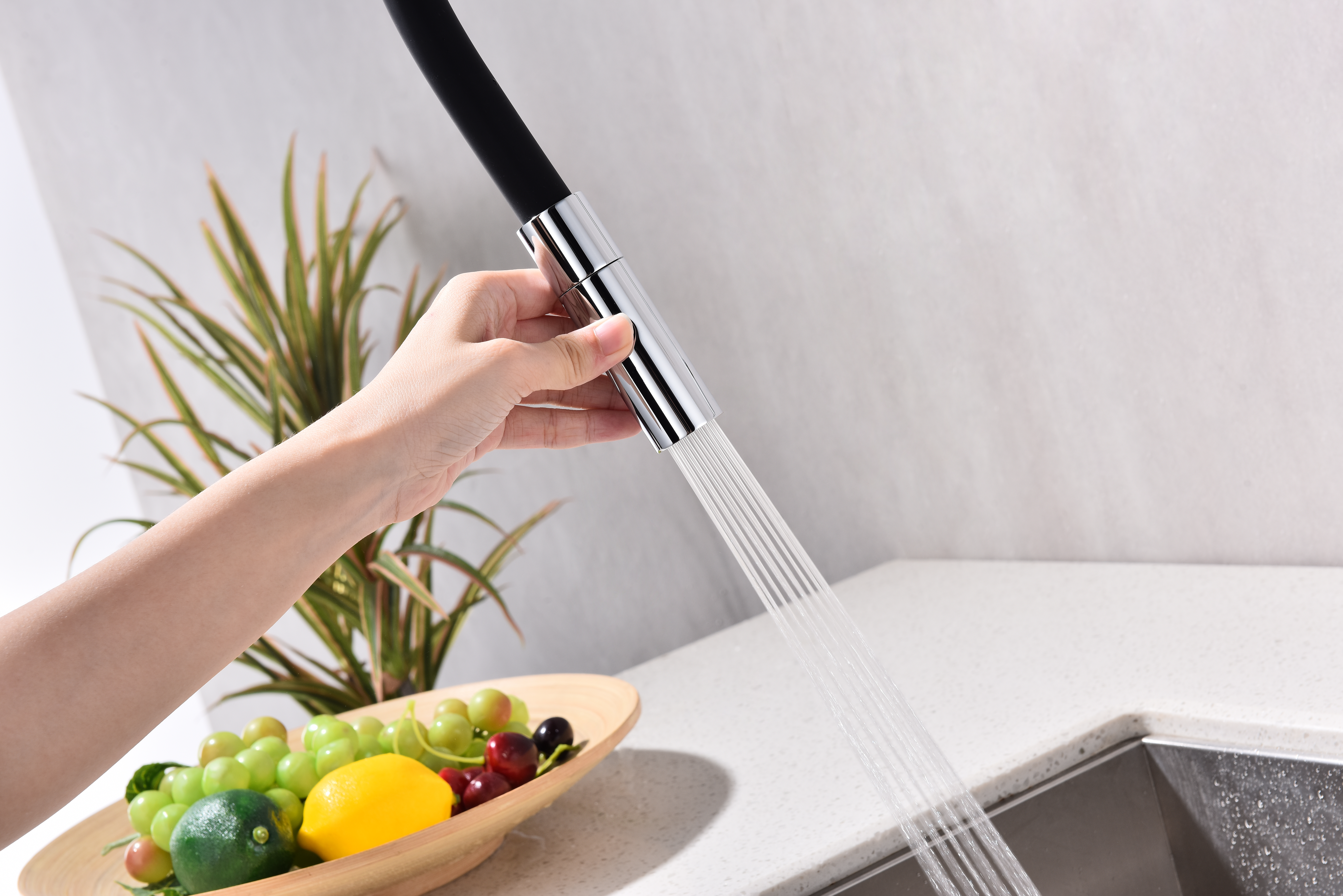Гибкий силиконовый излив оснащен функцией деликатного душа и магнитным механизмом фиксации в задней части латунного корпуса. Он позволяет ополоснуть посуду или мойку в любой ее части или наполнить емкости даже на столе рядом с мойкой.
